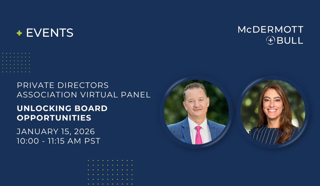 Rod McDermott, CEO + Co-Founder of McDermott + Bull, and Veronica Maceira, Managing Director at McDermott + Bull Interim Leaders, will participate in the Private Directors Association’s upcoming virtual event, Unlocking Board Opportunities: Innovative Paths to the Right Role, held Thursday, January 15, 2026, from 10:00 to 11:15 AM PST.